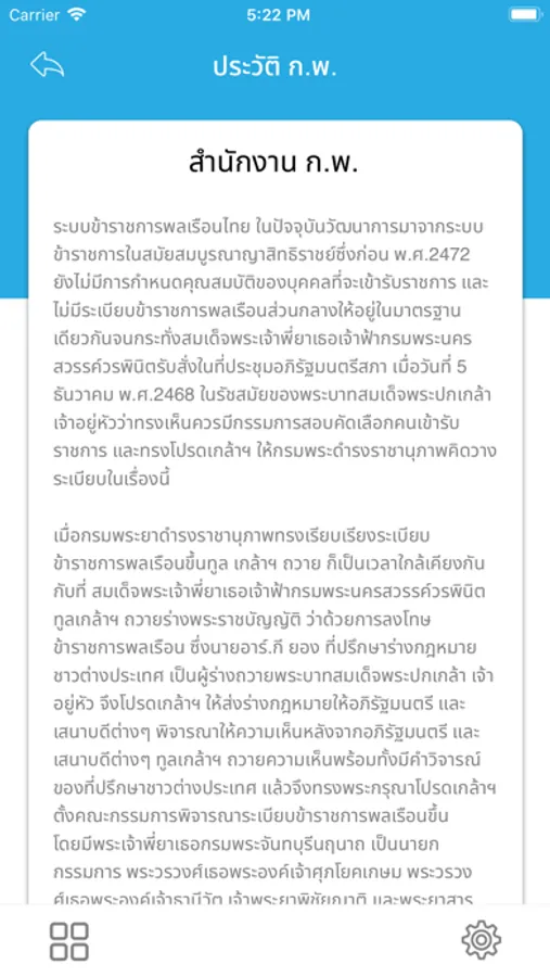 สำนักงาน คณะกรรมการข้าราชการพลเรือนหรือเรียกโดยย่อว่า สำนักงาน ก.พ. องค์กรกลางด้านการบริหารทรัพยากรบุคคลในราชการพลเรือน ส่งเสริมการพัฒนาข้าราชการและบุคลากรภาครัฐให้มีคุณภาพชีวิตและการทำงานที่ดี และพัฒนาระบบการบริหารกำลังคนในราชการให้เป็นกลไกการขับเคลื่อนยุทธศาสตร์ชาติอย่างมีประสิทธิภาพ ผดุงไว้ซึ่งระบบคุณธรรมในราชการพลเรือน ได้พัฒนา Application เพื่ออำนวยความสะดวกในการเข้าถึงข้อมูลข่าวสารประกาศต่างๆ ที่ทางสำนักงานเผยแพร่ประชาสัมพันธ์ให้กับผู้สนใจ รวมทั้ง Feature อื่นๆ เพื่อให้บริการแก่ข้าราชการพลเรือนสามัญ
