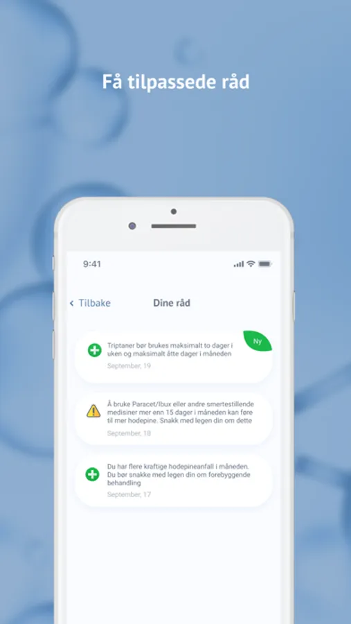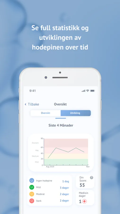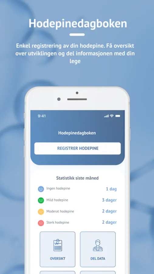 Med hodepinedagboken får du oversikt over din hodepine / migrene, og hvordan den utvikler seg over tid. Du får konkrete tilpassede råd i forhold til dine registreringer og medisinbruk.