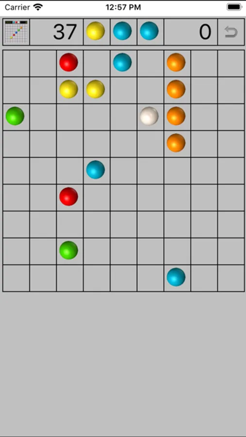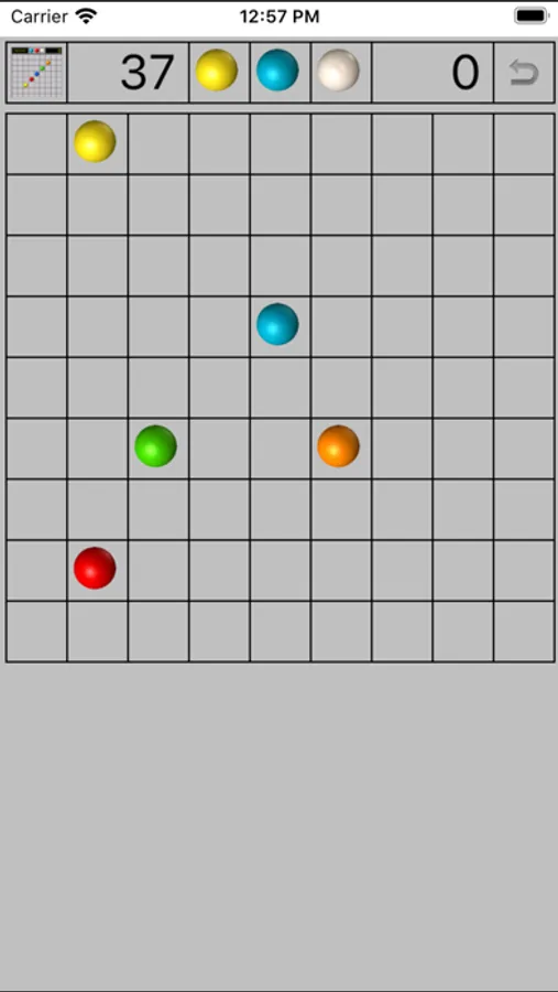 It is classic Color Lines. The game starts with a 9×9 board with three balls chosen out of seven different colours. If the player does form such lines of at least five balls of the same colour, the balls in those lines disappear, and he gains one turn, i.e. he can move another ball. If not, three new balls are added, and the game continues until the board is full.