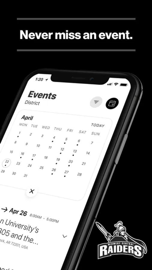 The event section shows a list of events throughout the district. Users can add an event to your calendar to share the event with friends and family with one tap.