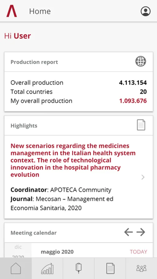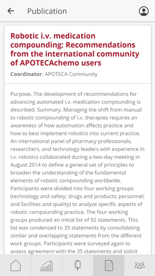 This App has been conceived to keep the Community always up-to-date on the most important news regarding APOTECA. It is composed of 4 main sections: Analytics, Drugs, Publications, Meetings. It contains both quantitative and qualitative info related to the practice with APOTECA as well as to the scientific and the network activities of the Community.