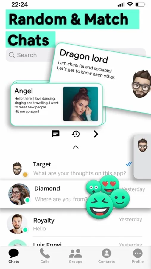 Anonymous Random Chat. Secure: Block ScreenShots/ScreenRecordings. Match, Chatrooms, Video & Audio Call, Vocals, Translate, Share Location, Pics & Files.