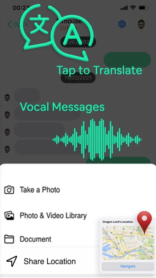 * TRANSLATE instantly: choose your language (in chat's blue world icon) & double tap directly on text message
