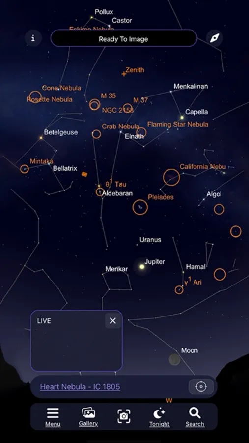 In the Planetarium View, objects highlighted with orange circles are the best targets. Tap an object to select it and display its name. Zoom in to find fainter objects. To point Origin to your chosen object, tap the crosshairs icon or use the “Center Object” option in the Object Info bar.
