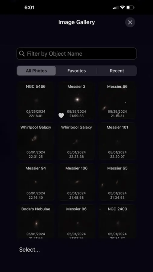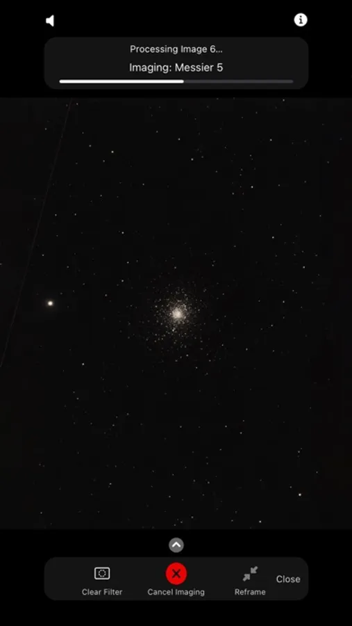 The Camera View displays a live feed from Origin’s camera. Here, you can start imaging sessions or adjust camera settings. Origin automatically stacks and processes each exposure using its built-in AI algorithms. This processing doesn’t add new data to your image but rather brings out the best in your data and reduces noise. When you’re finished, tap “End Imaging” to save the final stacked master to the Image Gallery and your device’s camera roll.