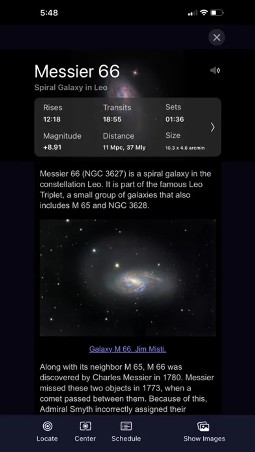 You can view detailed information on every object in the Origin app’s database by pressing the Info button. You can also listen to audio presentations for over 200 of the most popular celestial objects.