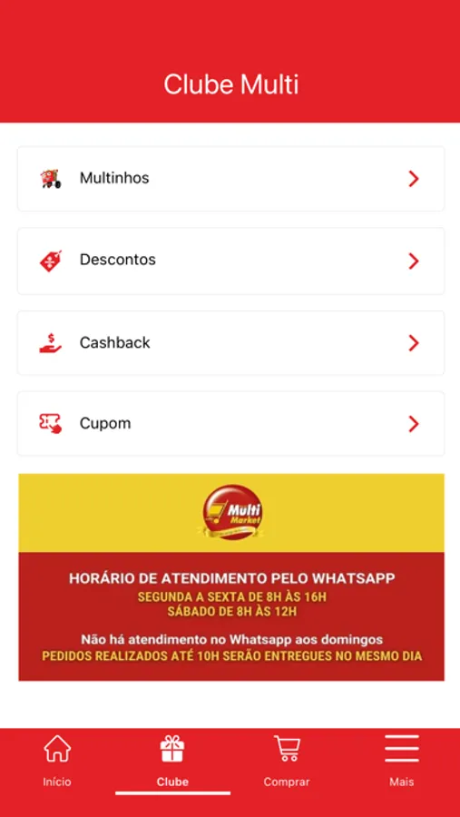 Você pode fazer seu pedido de compras e acompanhar o status de seus pedidos. Ao fazer compras nos supermercados Braga, você pode acumular pontos que são trocados por brindes no App Clube Multi. Após trocar seus pontos por brindes, você pode retirar seu brinde em uma loja dos supermercados Braga. Caso não esteja disponível o brinde desejado, você pode "destrocar" seu brinde por pontos e escolher um novo brinde. Você também poderá compartilhar seus pontos com seus amigos.