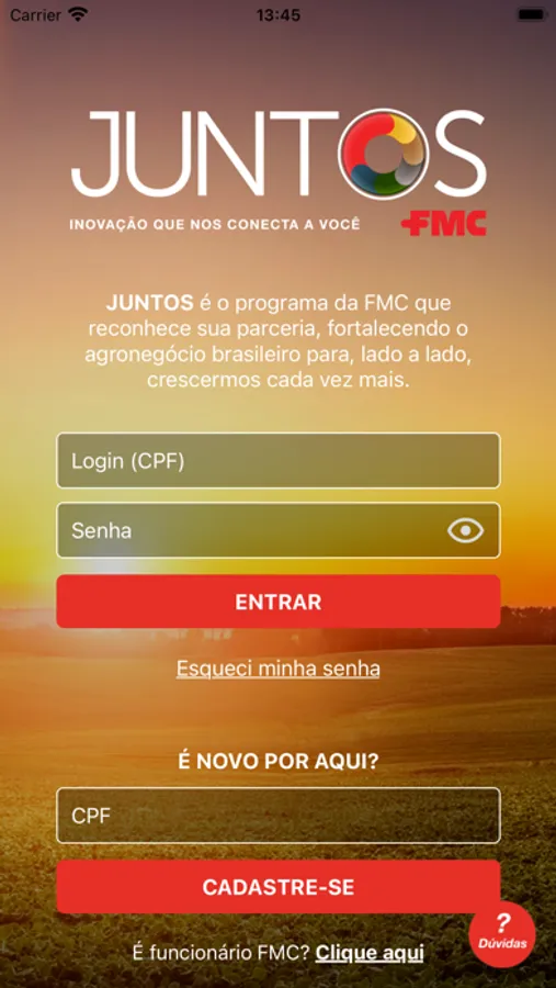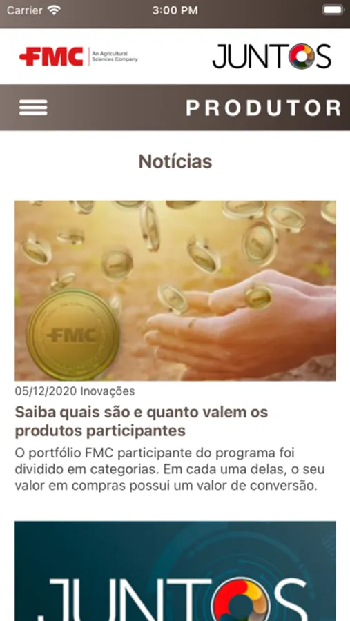 O app Juntos FMC chegou para você! Neste app, destinado a produtores e distribuidores agrícolas do Brasil, é possível acompanhar o desempenho de campanhas, notícias, além de encontrar as melhores soluções para todas as etapas de diferentes cultivos. Instale agora no seu smartphone e descubra os benefícios em comprar ou distribuir produtos FMC.