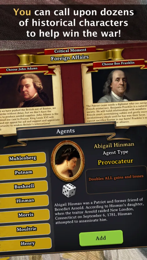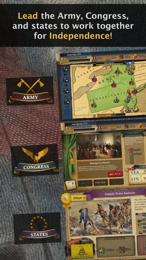 * Meet famous revolutionaries including Continental Army officer Alexander Hamilton, Native American leader Daniel Nimham, and African American poet Phillis Wheatley, who you can deploy at unique moments to give you gameplay advantages when it's needed most.