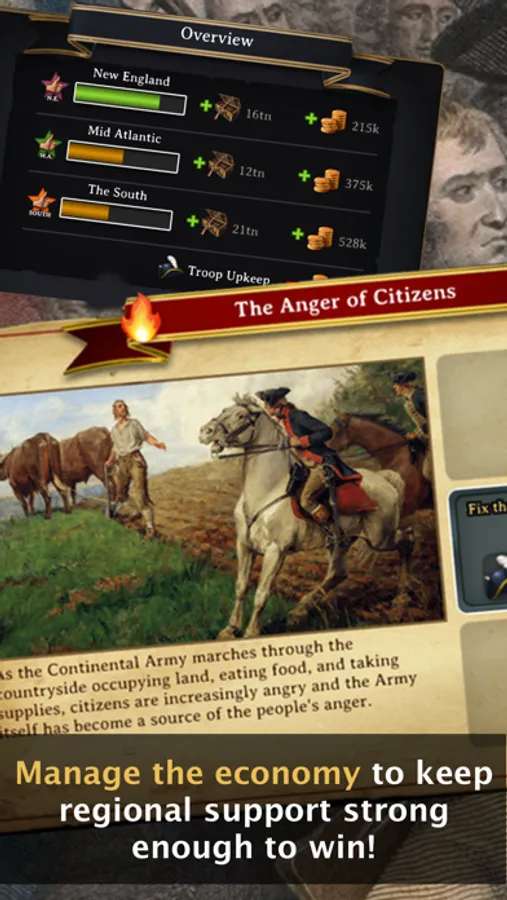 Victory is ultimately attained by defeating the British, but you must also establish and protect the high ideals of universal liberty and natural rights while nurturing the fragile union of the states. There are soldiers to recruit, armies to supply, and money to raise to fight the war for independence.
