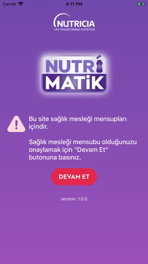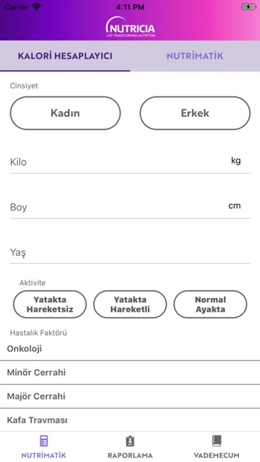 Sağlık Meslek Mensuplarının kullanımına yönelik bir uygulamadır. Girişi yapılacak hiç bir bilgi uygulama üzerinde saklanmayacaktır ve Nutricia'nın bu bilgilere hiçbir şekilde erişimi yoktur. Nutricia'nın bilime, eğitime ve hasta sağlığına koşulsuz desteği ile oluşturulmuştur. Bu uygulamadaki bilgiler, hekim veya eczacıya danışmanın yerine geçemez. Nutricia bu uygulamayı güncel tutmak için gerekli çabayı göstermekle birlikte zaman içerisinde bazı bilgiler geçerliliğini yitirmiş olabilir. Güncel ürün bilgisi için her zaman firmamıza başvurunuz.