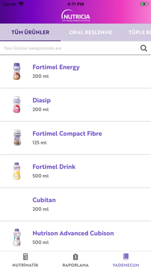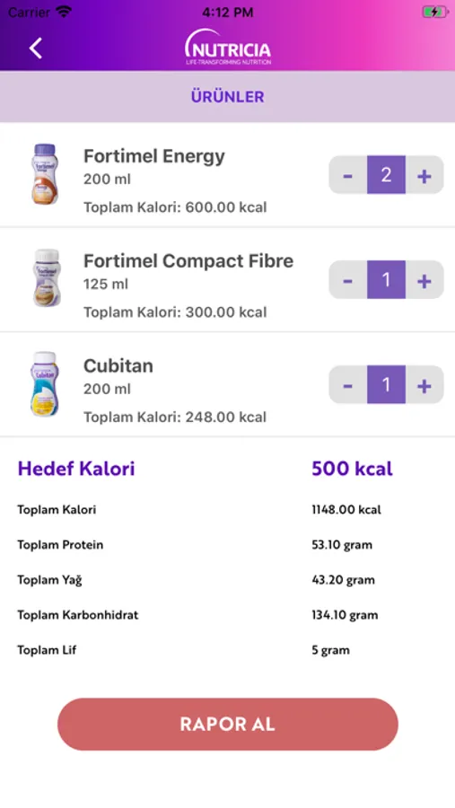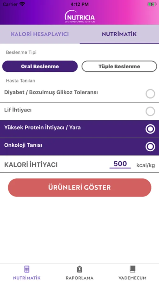 Nutrimatik ile hastanızın cinsiyet, kilo, boy, yaş ve hastalık faktörüne göre ihtiyacı olan kalori miktarını hesapladıktan sonra oral veya tüple beslenme seçiminin ardından, diyabet, bozulmuş glikoz toleransı, lif, protein gibi ihtiyaçlarını belirleyerek hastanız için ürün önerilerini uygulama üzerinde görüntüleyebilirsiniz.