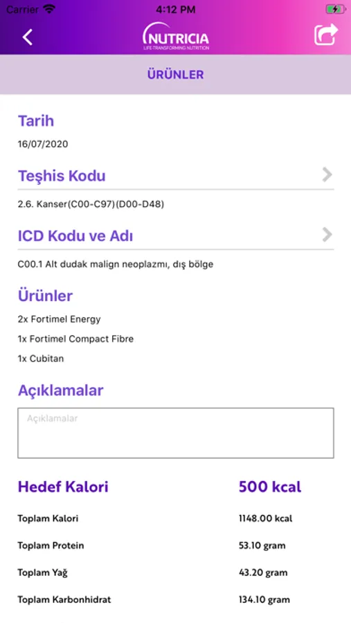 Nutrimatik, ürün seçimini tamamlamanızın ardından içerdiği rapor bölümünde ICD ve teşhis kodlarına kolayca ulaşmanızı sağlarken, dilerseniz raporu mail olarak paylaşmanıza olanak tanır.