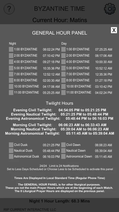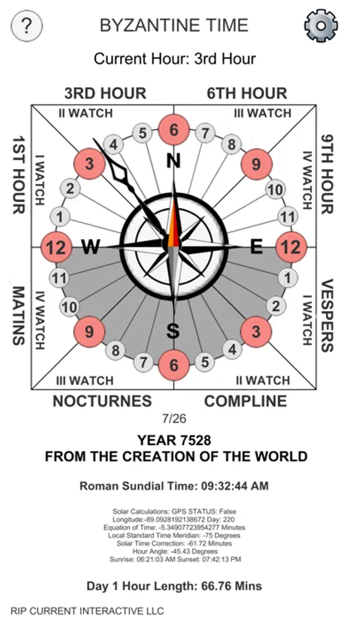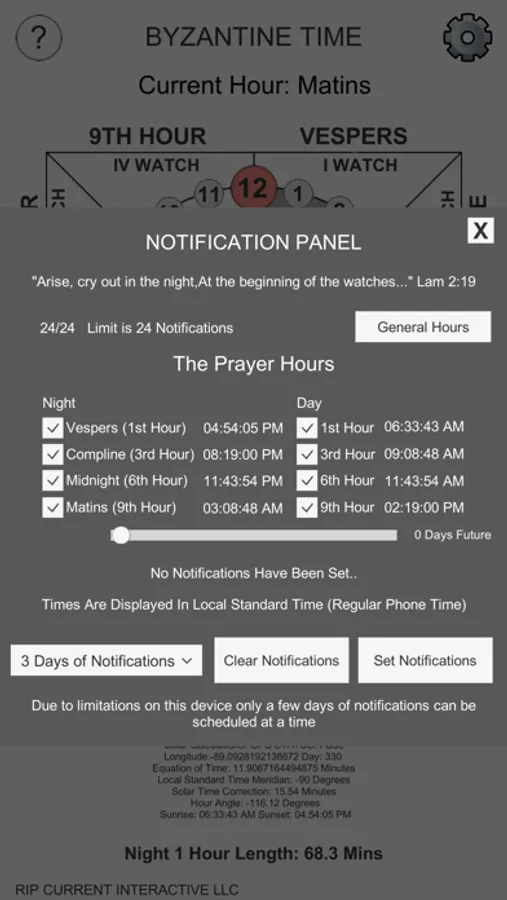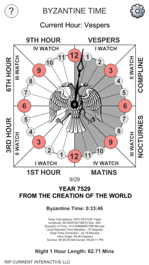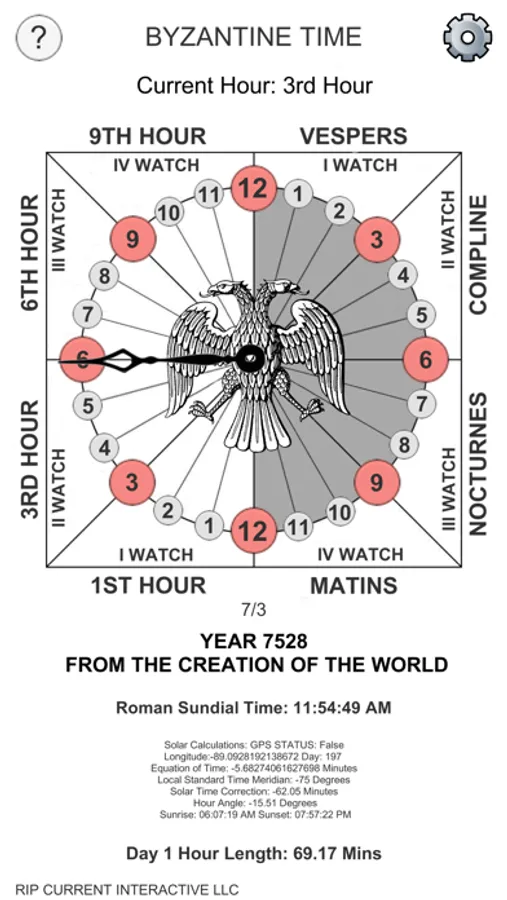 Byzantine Time is originates even before the Byzantine Empire found among Ancient Judeans. It uses unequal hours like a Sundial. The next day begins at Evening rather than midnight on modern clocks. This Application Requires GPS to operate. How ever you can manually type in the Longitude and Latitude in the settings.