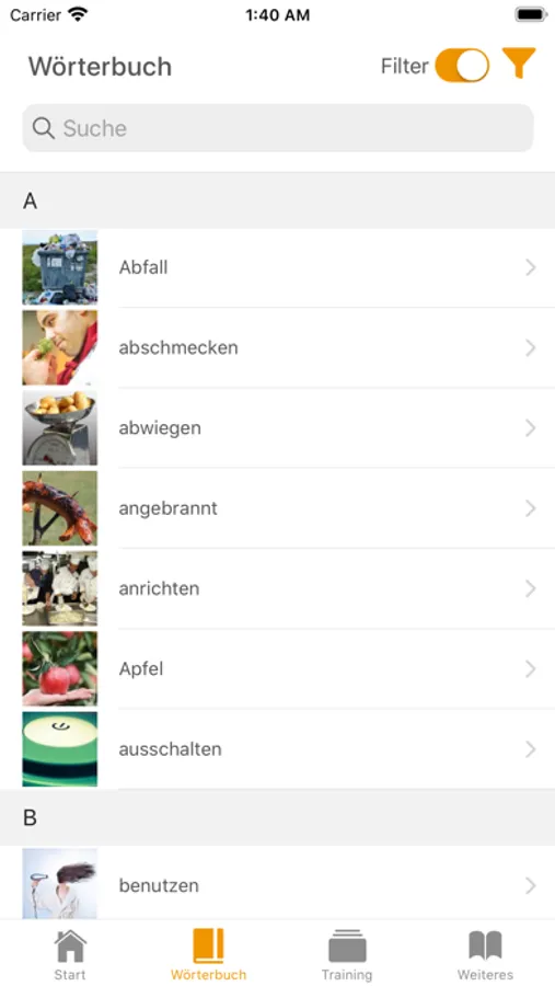 Filtern Sie die Wörter im Glossar und Training nach gewünschten Themengebieten.