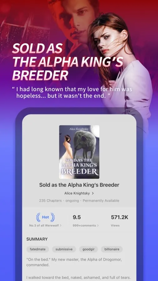 Storysome is a romantic world where you can dive in thousands of attractive werewolf stories and romance stories. Are you a fan of alpha and mated werewolves? Billionaire CEOs? Bossy bad boys? You should really have a try now!