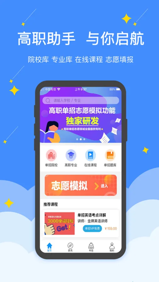 “高职助手”是一款融合四川省高职单招与线上教育的app,将错综复杂的各种考试资讯与“互联网+”相融合。用科技助力教育的发展,用科技让每个人享受更好的教育。我们提供一站式服务,功能包含在线直播教学(后续更新)、网班管理(后续更新)、考试题库、高清录播课程、院校库、专业库查询等;我们拥有独家专利,拥有全川唯一一套权威自编的智能填报单招志愿的系统;我们提供多平台使用,各大应用市场均可下载;我们秉持“一切为了学生”的理念,产品按需付费,大部分功能免费开放,让用户最小成本获取最有用的高职单招信息,让家长和学生放心的让我们为梦想保驾护航。