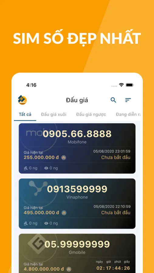 Ứng dụng Đấu Giá Sim cung cấp dịch vụ đấu giá sim số đẹp trực tuyến công khai, minh bạch. Giúp quý khách có cơ hội mua sim đẹp nhất, với giá hời nhất!
