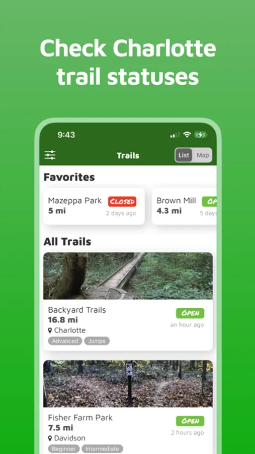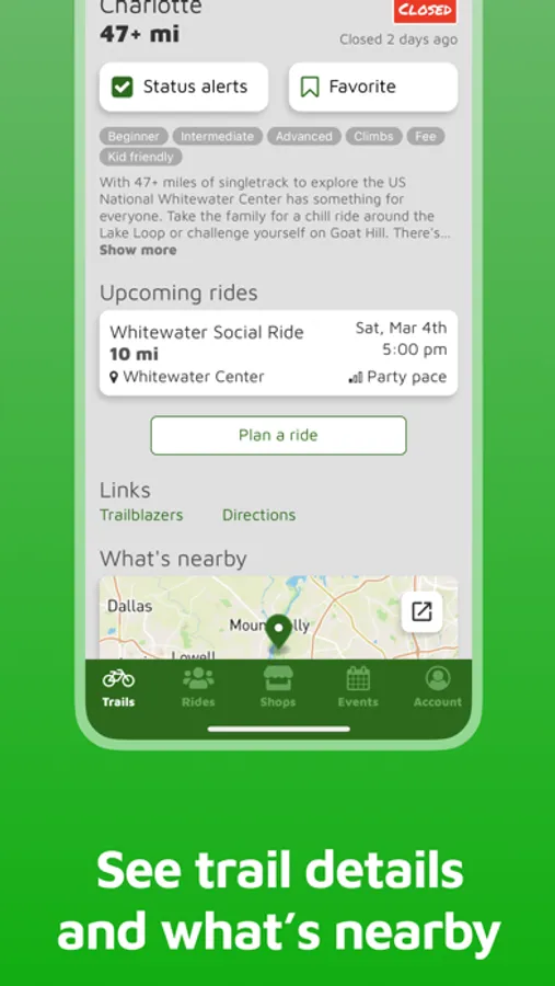 Charlotte's mountain bike trail guide. Find local trails matching your riding level and amenities including bike shops and post-ride food and beer. And with trail alerts, you'll be the first to know when your favorite trails open or close.