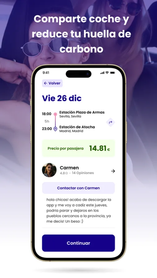 Lo tienes claro, prefieres que te lleven y viajar de la forma más barata, cómoda y directa posible. Podrás elegir el viaje que mejor se adapte a tus necesidades y decidir si quieres viajar con tu mascota, si prefieres un coche libre de humos, si escuchar música, si hablar mucho o incluso… ¡dormirte con la cabeza en la ventanilla! Encuentra tu viaje perfecto y al final del trayecto, ¡envía una opinión al resto de chicas!