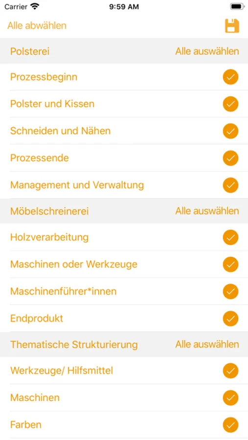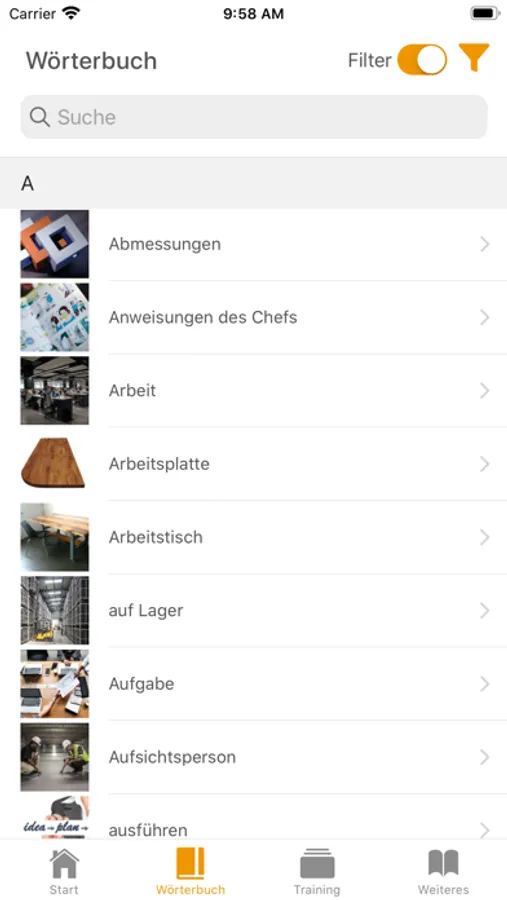 Filtern Sie die Wörter im Glossar und Training nach gewünschten Themengebieten.