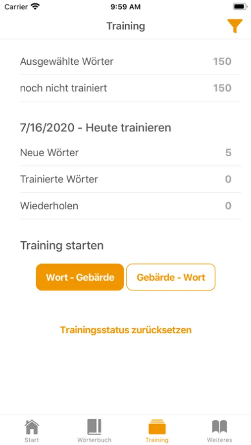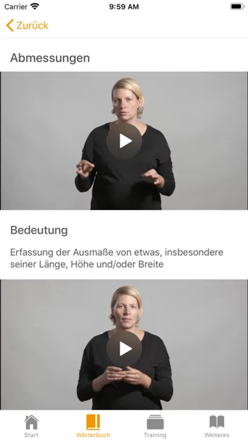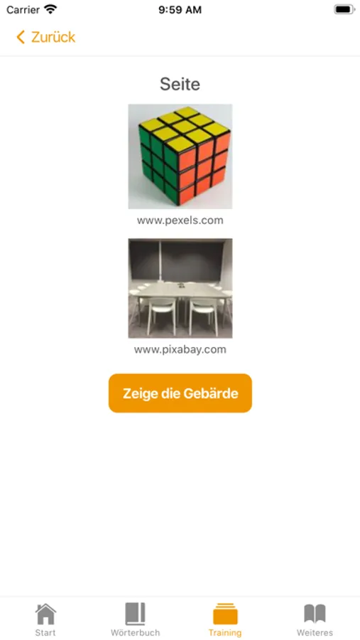 Trainieren Sie Wörter und Gebärden. Betrachten Sie sie schritlich oder in Gebärdensprache und lernen Sie die Übersetzung.