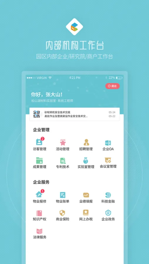 访客预约、企业OA、科技成果转化、专利技术服务,为园区企业办公提供从硬件到软件一体化、智慧化服务!
