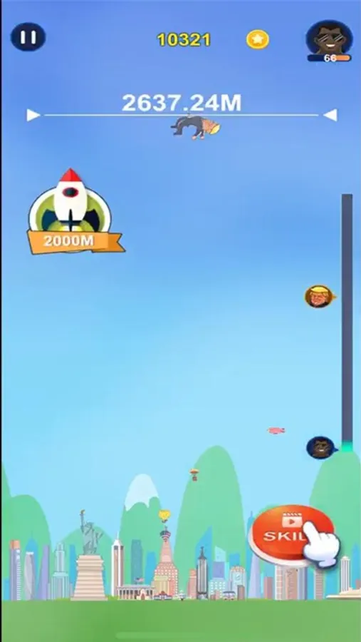 Choose the skin, then tap the screen to throw the character into the sky. When he falls to the ground, you can tap to raise his arm and then throw it again. Your rising height determines yourview.