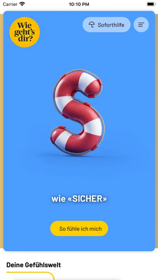 Die «Wie geht’s dir?»-App hilft dir, deine psychische Gesundheit zu stärken. Du lernst, die ganze Bandbreite deiner Gefühle bewusster wahrzunehmen, sie zu dokumentieren und mit Hilfe gezielter Massnahmen besser mit ihnen umzugehen – von A wie «AUSGEBRANNT» bis Z wie «ZUFRIEDEN».