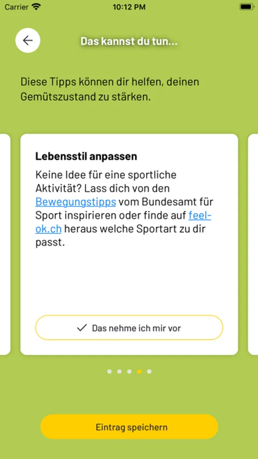 Wichtig: Diese App stellt keine Diagnose oder medizinische Behandlung dar, und ersetzt in keinem Fall eine Beratung durch medizinisches Fachpersonal. Alle Inhalte dienen ausschliesslich zu allgemeinen Informationszwecken. Auf https://www.wie-gehts-dir.ch/de/adressen-und-angebote/ich-suche-unterstuetzung findest du Beratungsstellen zur Unterstützung in schwierigen Lebenssituationen oder bei einer psychischen Erkrankung.