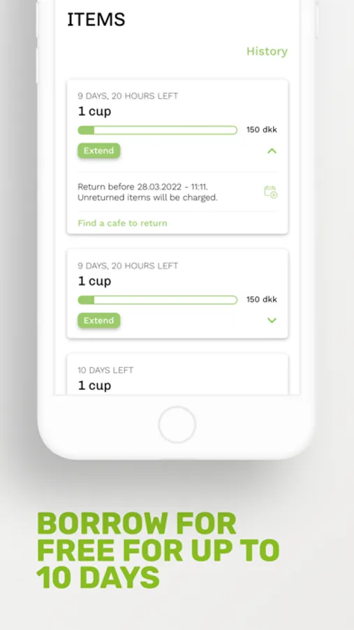 You can keep the borrowed items for up to 10 days and return them to any participating cafe or restaurant.