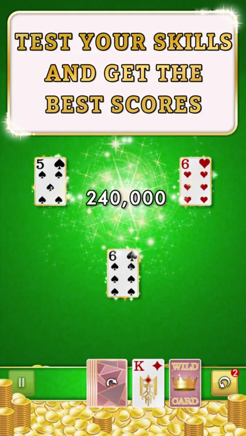 The aim of the game: clear the cards from the layout as quickly as possible! Using the face-up cards and the wild card at the bottom, place cards in ascending or descending order. Aces are both high and low so you can put either a King or a 2 on it. Don’t forget to use your wild card if you need it! Not only can you play any card on it, it could help you beat anyone who dares to challenge you!