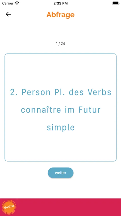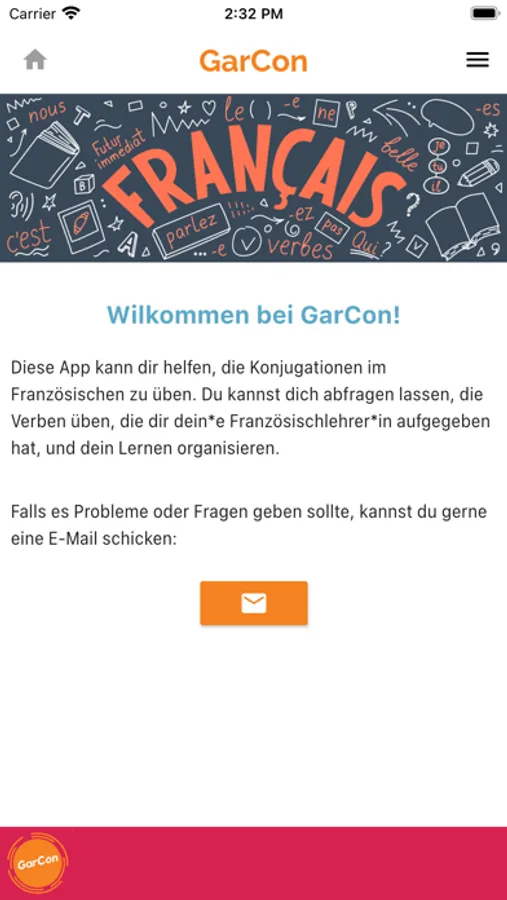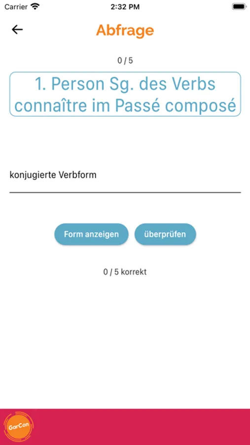 GarCon lässt dich französische Verbkonjugationen im Lernmodus einüben, fragt dich Verbbestimmungen oder Verbformen ab und verwaltet deine persönlichen Bestleistungen. Dein*e Französischlehrer*in kann deinem Kurs Verben in bestimmten Zeiten zum Üben zuweisen - so bist du immer auf dem neuesten Stand!