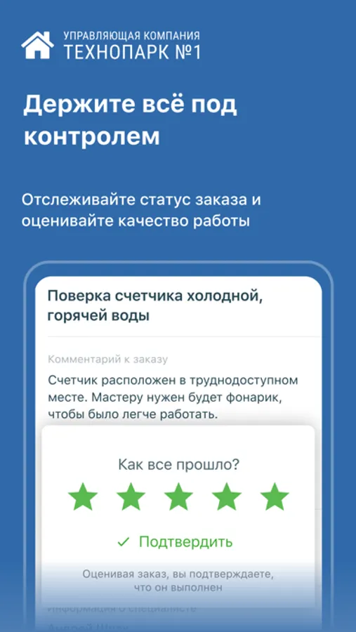 • Отслеживать статусы заявок и оценивать качество работ;