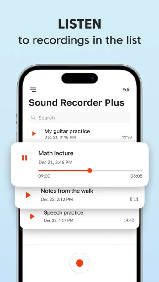 A mini-player available in the Recordings list allows listening to the recording right away, and the full-screen player offers an advanced playback feature set.