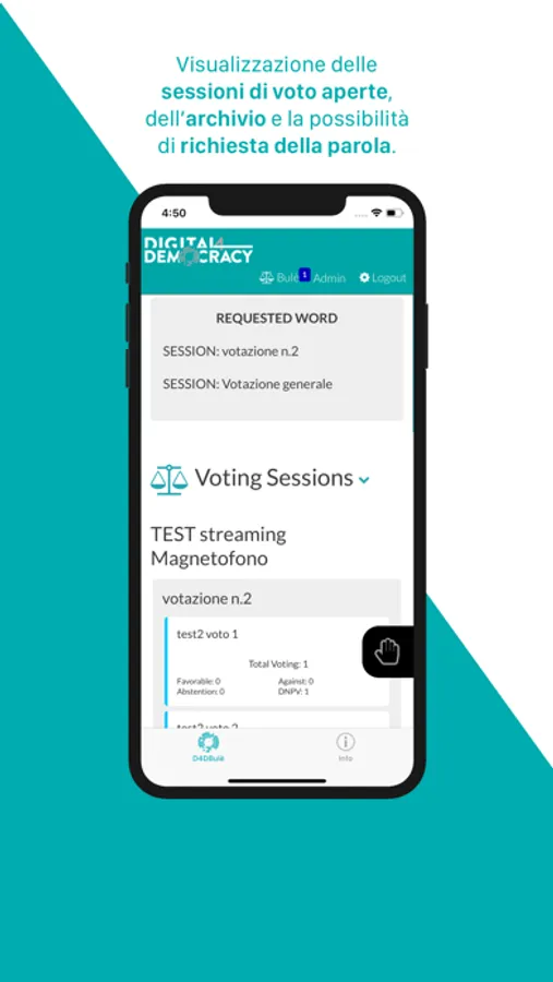 Inside the app there is an administrative panel accessible via web that allows you to create a voting session, check the number of participants who declare their presence, manage the voting session, collect, share and print the results.