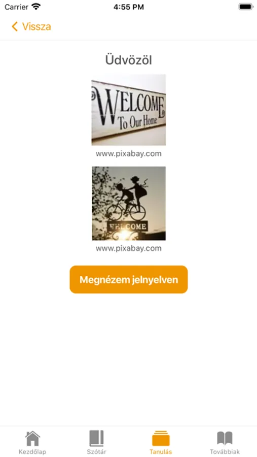 Tanulj új szavakat és jeleket. Nézd meg a kifejezések írott vagy jelelt változatát, és jegyezd meg a fordításait.