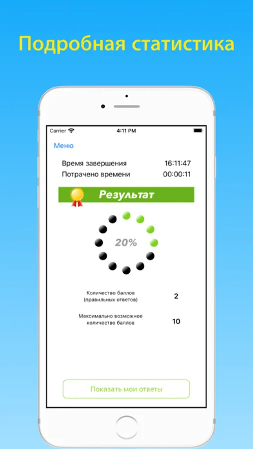• Работа над ошибками - в режимах "Экзамен", "Марафон" и "Тренировка в избранном" Вы можете сделать работу над ошибками.
