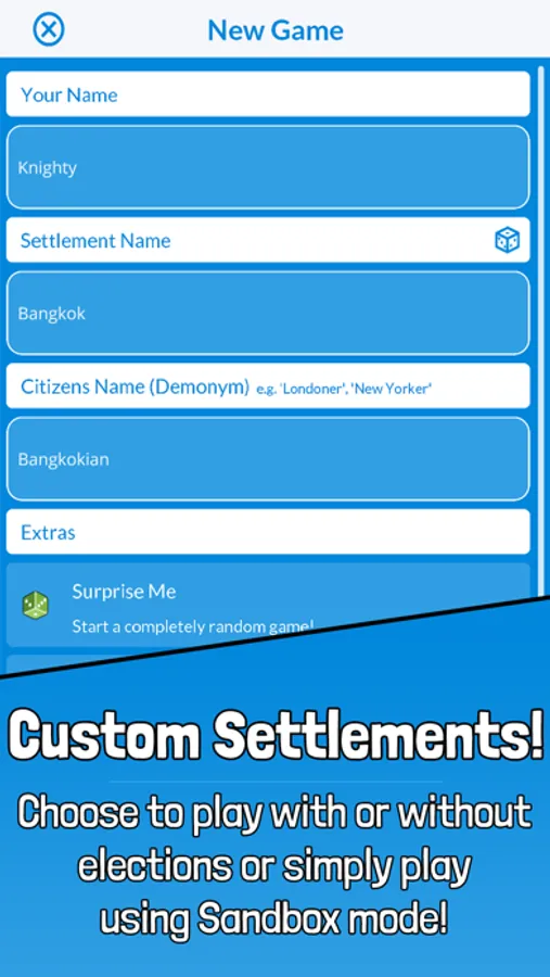 SimMayor is a text based city building mayor simulator which gives you control of everything. When starting the game, you can name your mayor, the settlement and citizen names or, you can just choose to randomize them, it’s up to you!