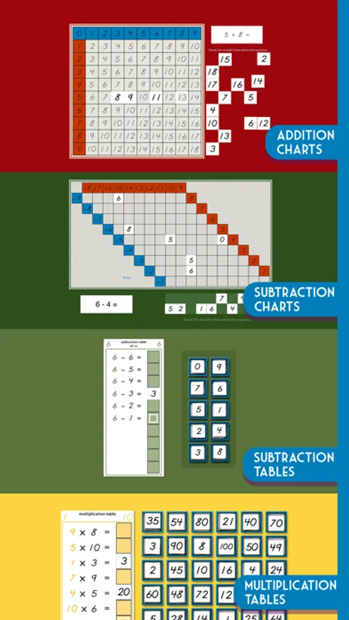 Arithmetic: Practice addition, subtraction and multiplication with the Montessori Charts and Tables activities.