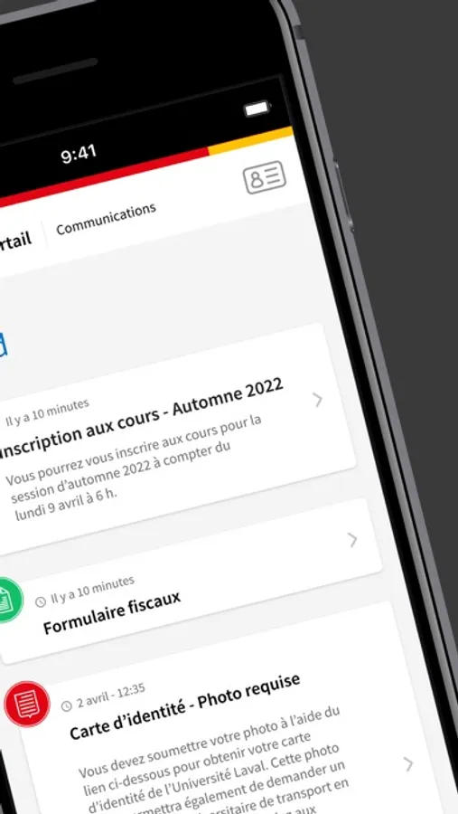 L’Université Laval est heureuse de présenter l’application mobile MonPortail! En plus d'avoir accès en tout temps à votre carte d'identité virtuelle, vous pourrez voir le fil de messages de MonPortail et être avisé lorsqu'une nouvelle note est disponible. Plus besoin de rafraîchir la page internet de MonPortail, l’application enverra une notification en temps réel lorsque les notes ou autres informations importantes seront disponibles.