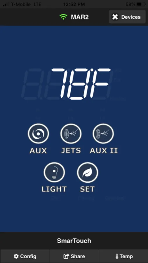 Supports Bluetooth and WiFi connections, temperature settings, time-of-day, Filtration, Share spa connection