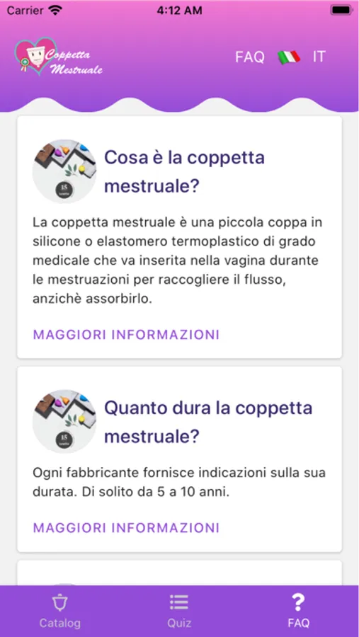 All' interno dell'applicazione troverai informazione utile sull'utilizzo e tipologie delle coppette mestruali.