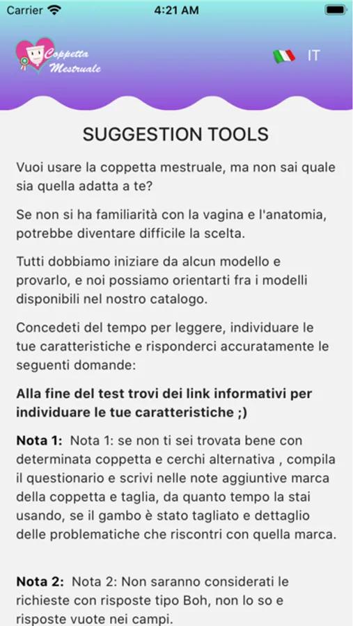 Con questa applicazione potrai ricevere suggerimenti sul tipo di coppetta mestruale da scegliere.