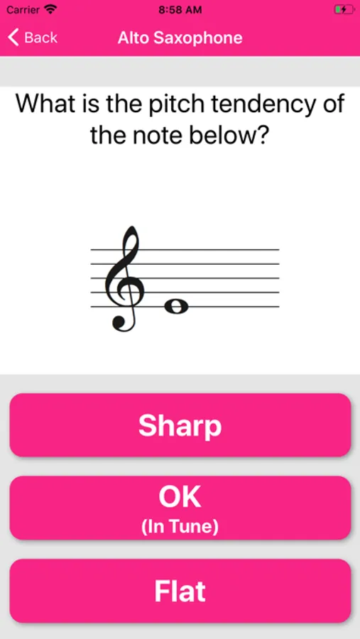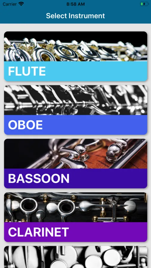 Once clicking past the home page of the application, the student is required to make a determination about which woodwind instrument they would like to select for a short, ten question pitch tendency quiz. I have designed this application to be geared toward the five most common woodwind instrument: flute, oboe, bassoon, clarinet in Bb, and alto saxophone.