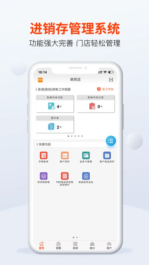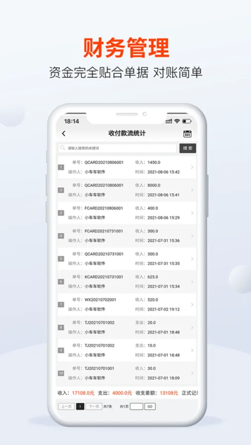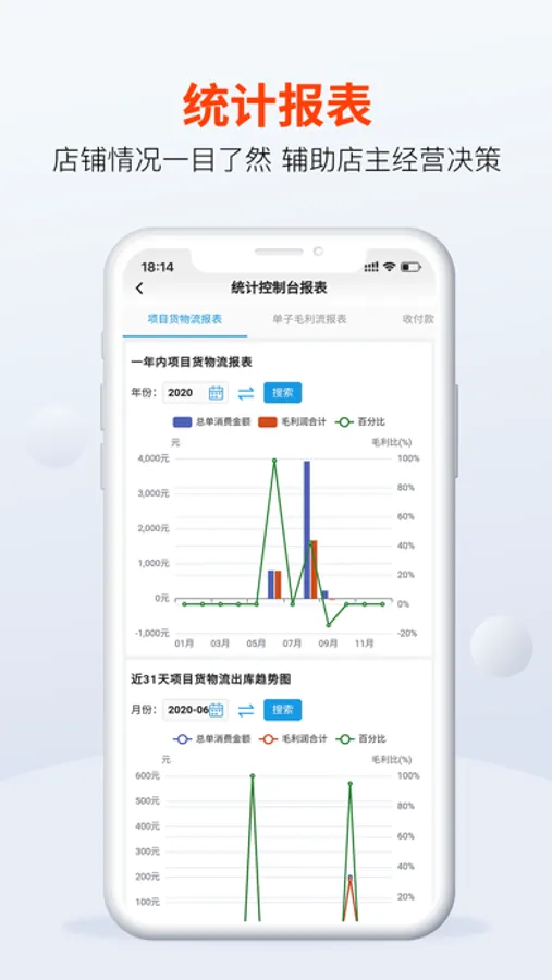管钱流:管理收银付款,查看盈利盈亏、财务报表等;