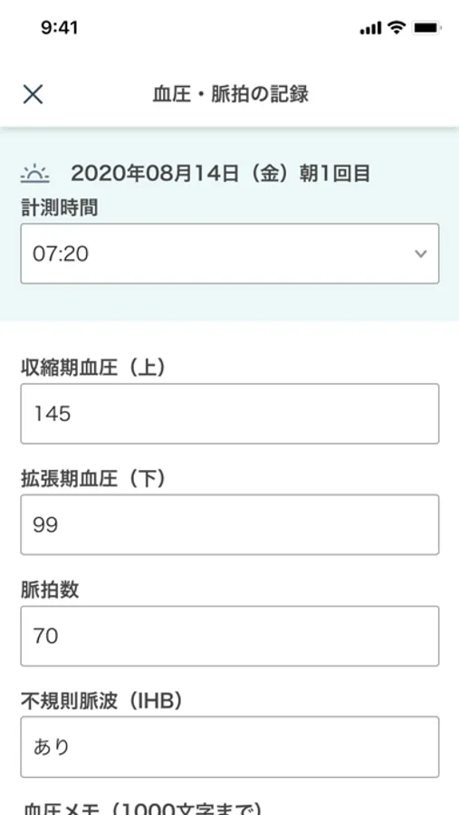 朝2回、夜2回の1日最大4回、血圧と脈拍を記録できます。