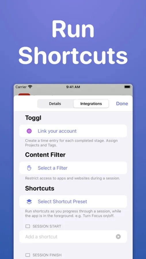 Start a session and perform actions via Shortcuts, Siri, and Spotlight. Start a session, Pause, Skip, Restart.