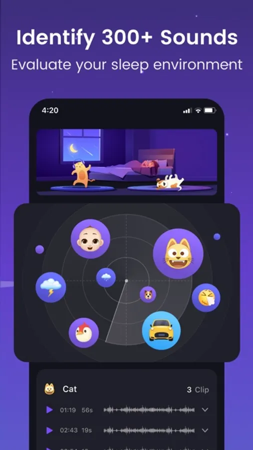 · Sleep ambient sounds detector - Accurately identify 303 different types of environmental sounds during your sleep. Your personalized sleep report uses vivid animations to show you which sounds are captured during your deep sleep. (Adapted to iOS15)