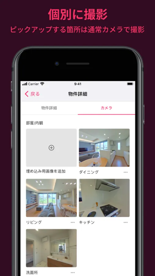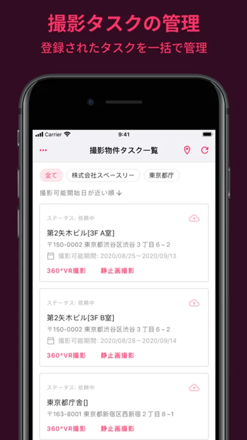 事業者の物件管理と連携し、その物件のVR撮影を、会社内の現場担当の撮影者や、外部の撮影事業者に依頼する形でのタスク管理が可能です。